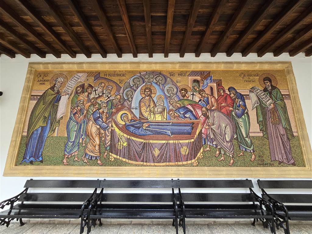 בחצר נמצא פסיפס מפורסם של מריה העולה השמימה, הנה היא במיטה