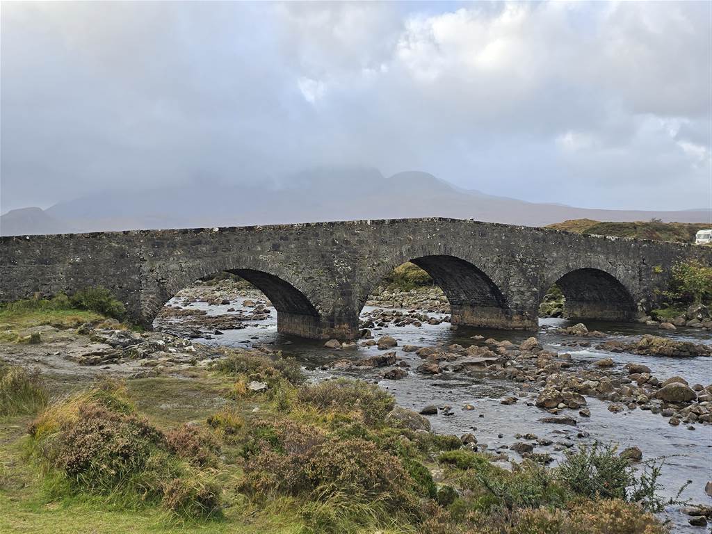 בדרך עדיין גשום ומעונן, אנחנו עוצרים בגשר העתיק Sligachan Old Bridge