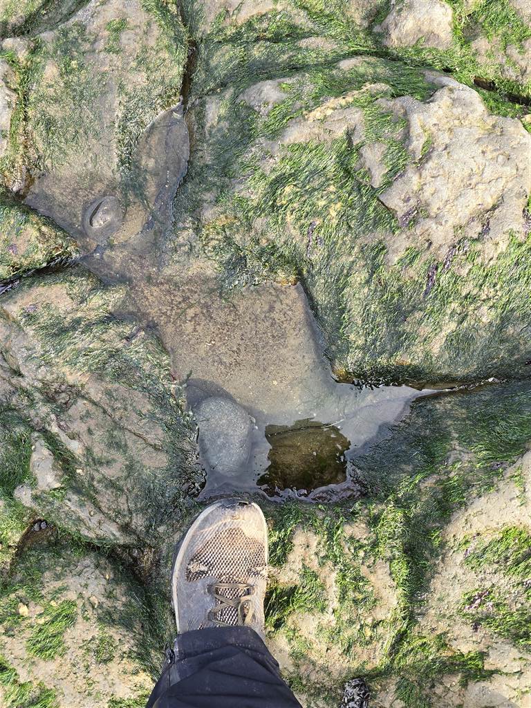 החוף אכן היה בשפל ודילגנו בין הסלעים מכוסי אצות, מים ויצורים ימיים למיניהם שנחשפו פתאום.