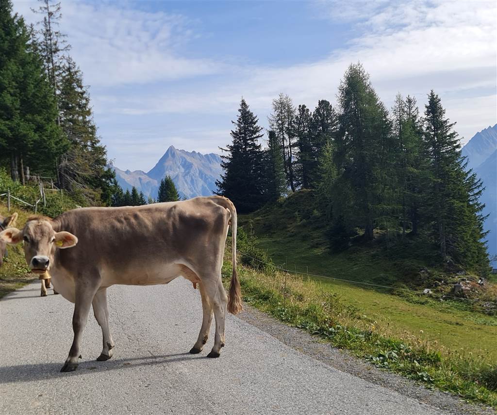 לקראת הרכבל השני אנחנו נתקלים בעדר פרות טירוליות מדנדנות בפעמונים..