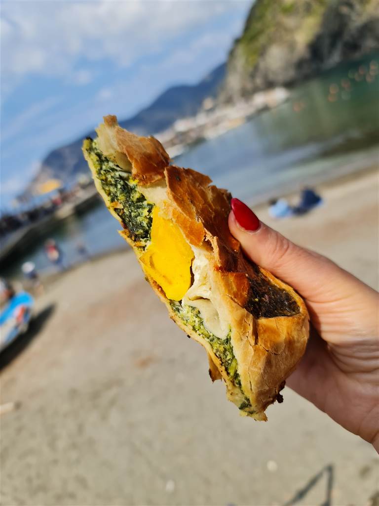 קנינו מגוון של פיצות ופוקצ'ות ואפילו קיש מקומי ממולא בריקוטה, ביצה ותרד, וישבנו להפסקה נהדרת על החוף!