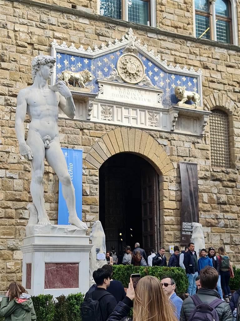 המשכנו לכיכר הסיניורה Piazza della Signoria בו נמצא הפאלאצו וקיו (ניתן לבקר בו וניתן לטפס לתצפית במגדל שלו ARNOLFO TOWER), ובחזיתו העתק פסלו של דוד.