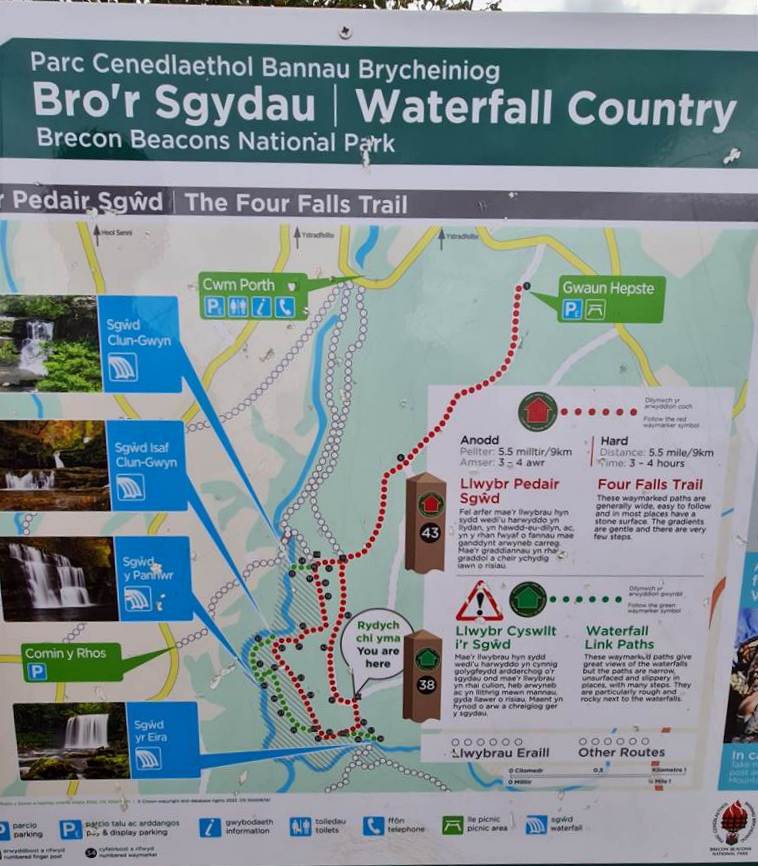 מתחילים לנווט לאחת החניות – לזו שרשמתי קוראים בגוגל מפס Four Waterfalls Car Park , מה שנשמע לי כשם מבטיח J , במפות של הפארק היא נקראת Cwm Porth (ועוד שיעור בוולשית – ה w הוא אות ניקוד ומבוטא כמו שורוק).