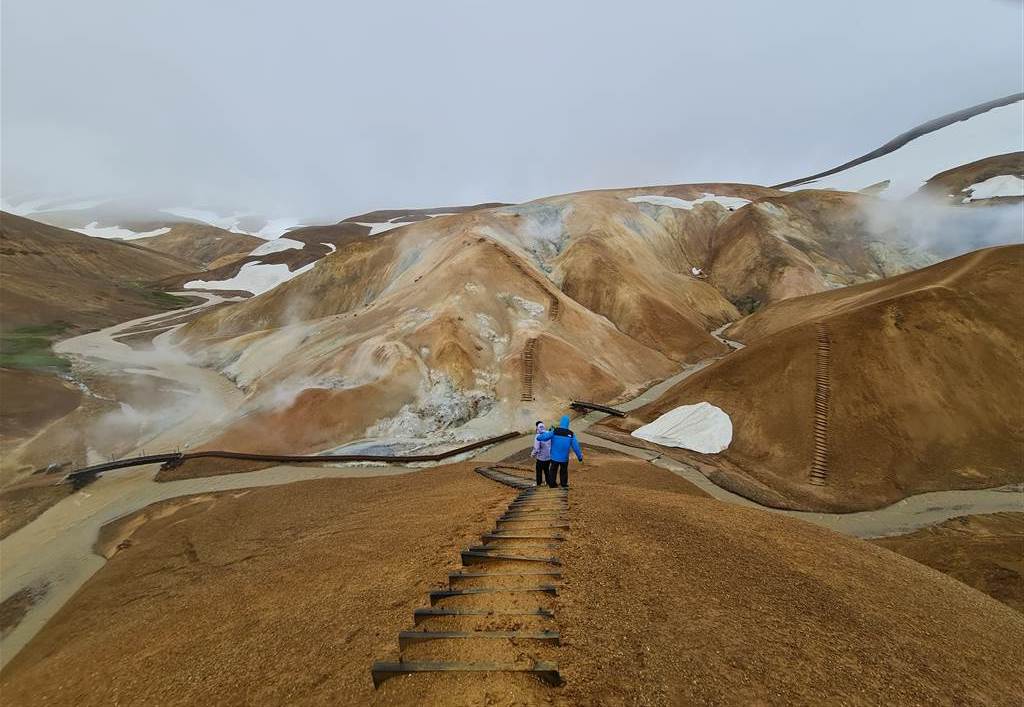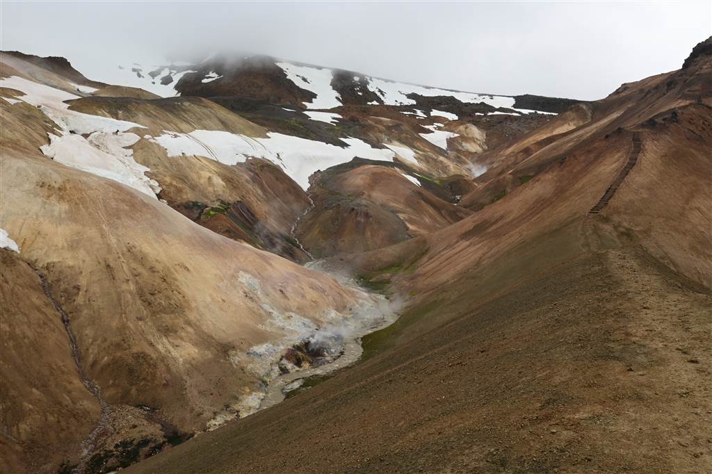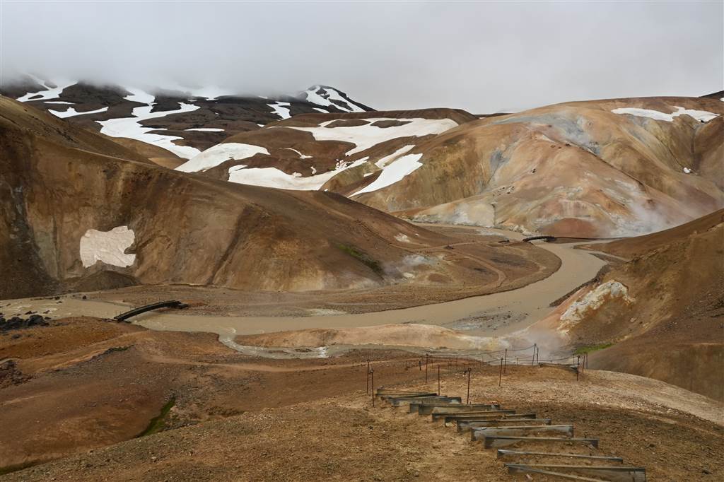 אנחנו יורדים במדרגות למסלול HVERADALIR, מסביבנו עולים אדים. (ב ALLTRAILS מופיע המסלול כחלק ממסלול ארוך יותר הכולל את הנסיעה ברכב עד לחניון אבל אפשר להעזר בו – פה).