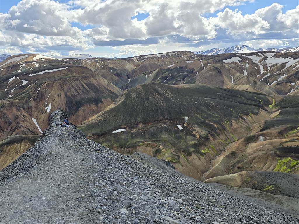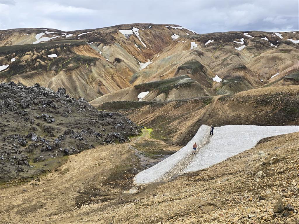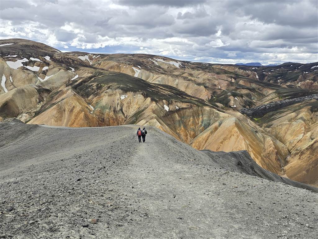 והנה מגיעים לצומת יפה ממנה אנחנו עולים על הר Brennisteinsalda (במסלול ירוק) אבל יש פה המשך מסלול אחר בו עוברים המטיילים בתמונה על שאריות השלג