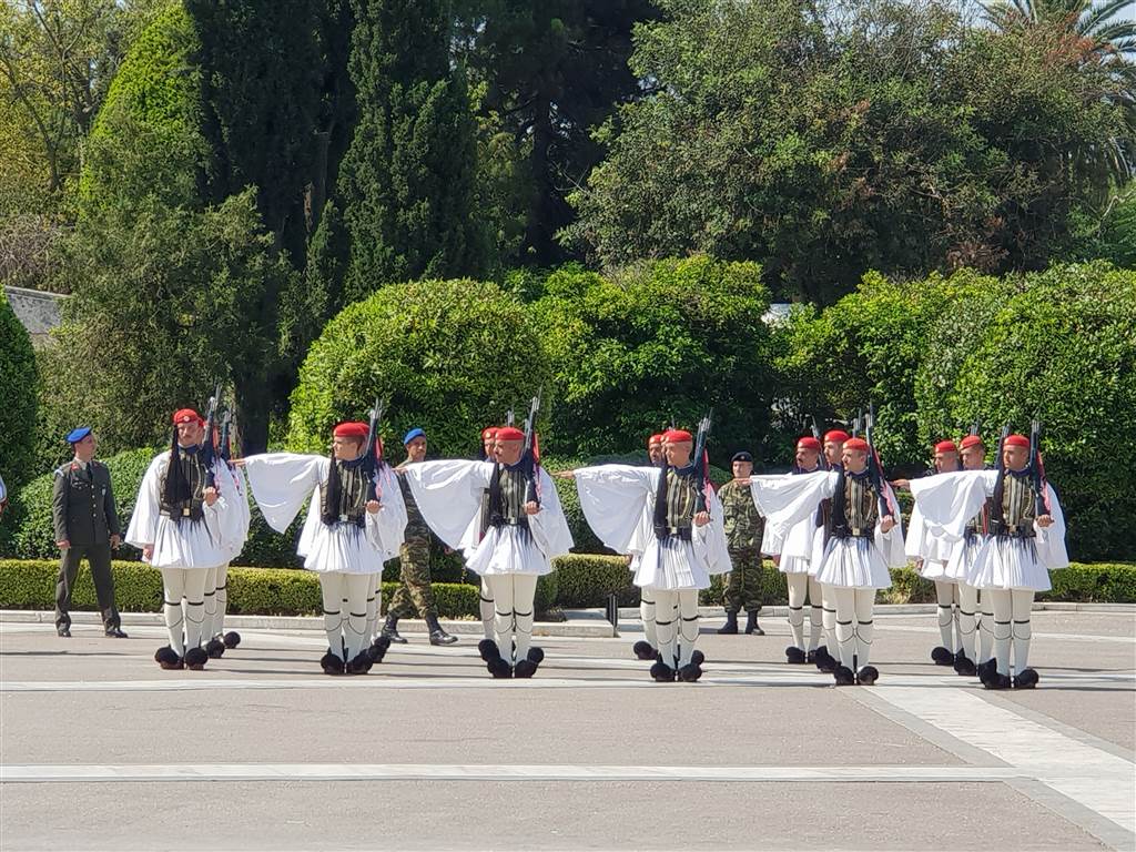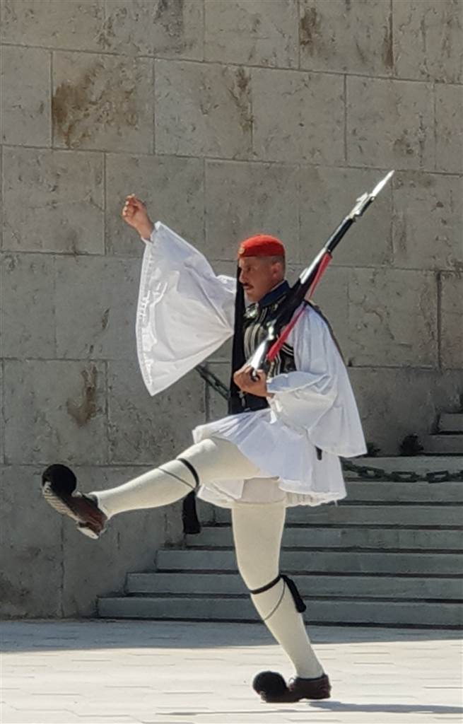 היום יום ראשון בשבוע, זהו יום של החלפות משמר חגיגיות של המשמר הנשיאותי (חיילים הנקראים “Evzones” ) השומרים על קבר החייל האלמוני בחזית הפרלמנט היווני, סמוך לכיכר סינטגמה Syntagma ("כיכר החוקה").