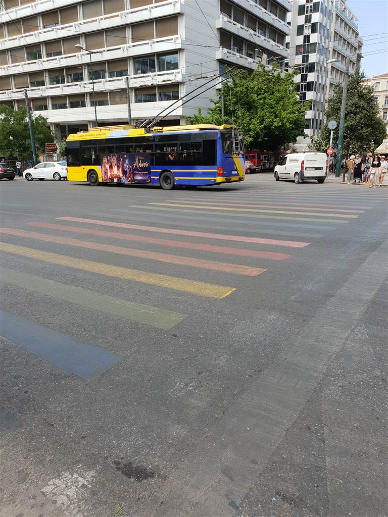 אנחנו עוברים את כיכר סינטגמה שבה נערך אתמול מצעד הגאווה, מה שנותר מהמצעד הוא רק מעבר החציה הצבעוני שהוקדש לטובת החגיגות