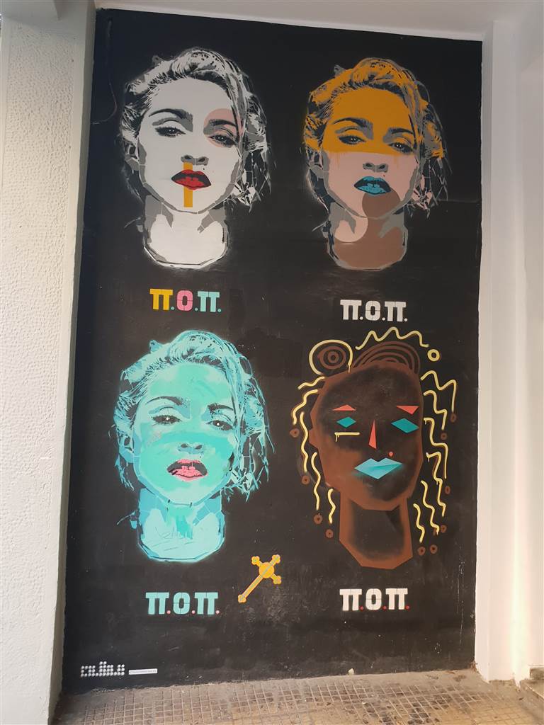 בכיכר הזו נמצא אחד מהגרפיטי המפורסמים של ותיקי האומנים, שנקרא Alexandros Vasmoulakis. האם הצחוק של הדמויות מלאכותי? נובע מיאוש? קראתי על כך אצל אמנון גופר, אני לא בטוחה שאני מסכימה לניתוח אבל זו הרי אומנות.. איש איש ודעתו. מה שבטוח שזה אחד הגרפיטי שמצטלמים הרבה יותר טוב מאשר נראים במציאות, ונוכחתי לדעת כבר במדריד שיש זן כזה…