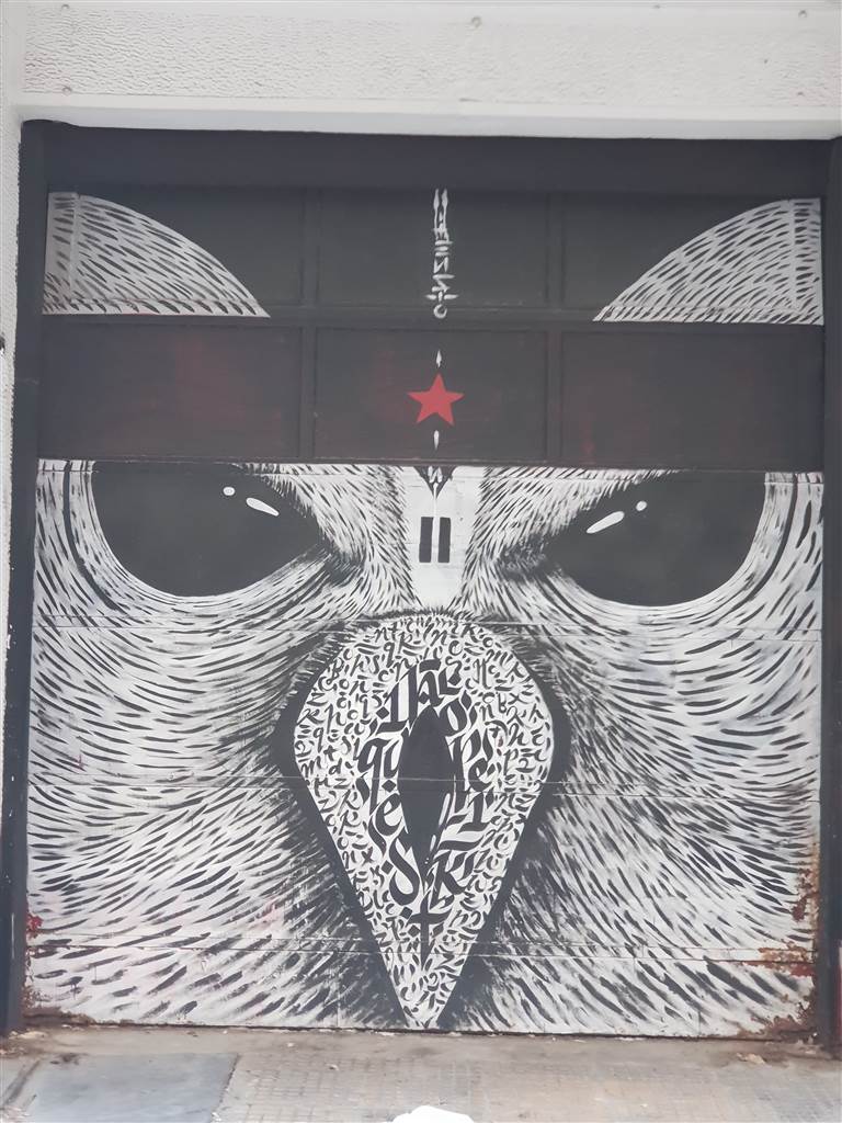 התחלנו בגרפיטי שנמצא בכיכר Iroon, הכיכר המרכזית של פסירי, קרובה מאוד לבית הקפה ליטל קוק. כיכר איירון משמעותה כיכר הגיבורים, ובאיזורה הרחובות נקראים על שמם של גיבורי מלחמת העצמאות היוונית.