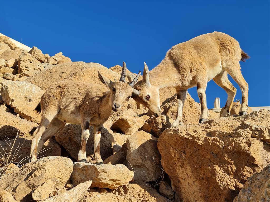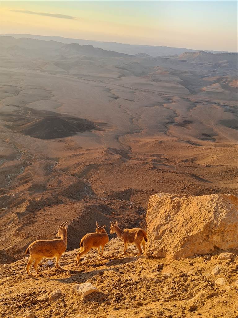 הלכתי לכיוון מרכז המבקרים ומצאתי שם משפחה שלמה של יעלים הולכת בנחת מלחכת עשב.