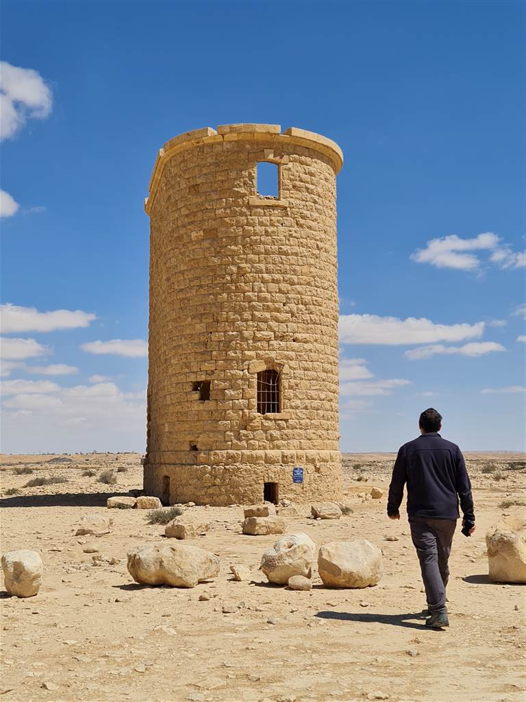 עוד כמה דקות נסיעה ואנחנו מגיעים אל עוג'ה אל חפיר, מגדל מים שנראה למרחוק. המגדל שימש למילוי מים במיכלי הרכבת.