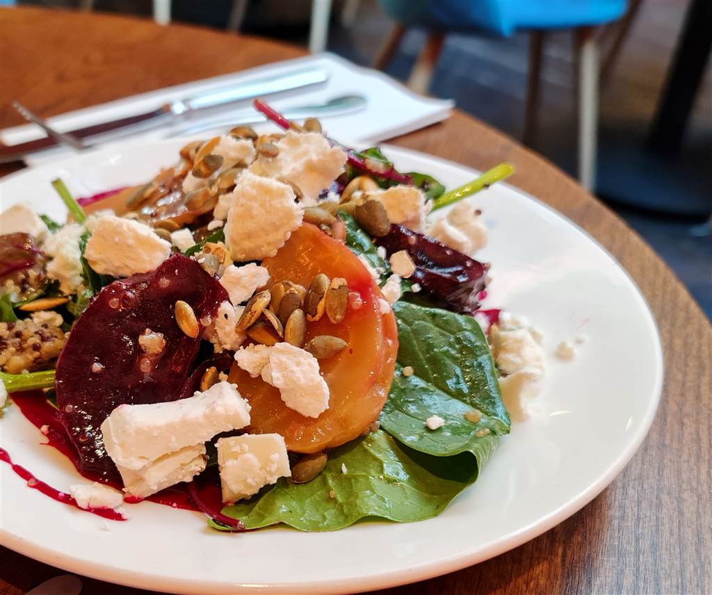 סלט דגנים עתיקים עם סלק צלוי וגבינת עיזים