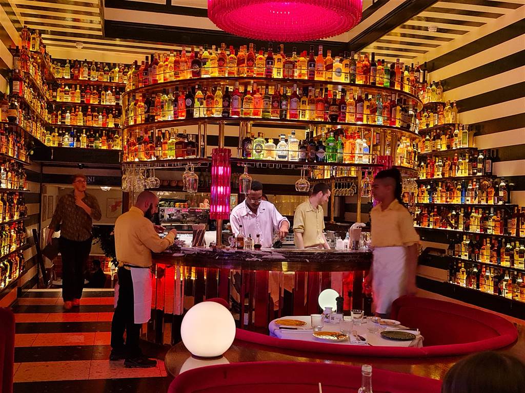 נכנסנו למסעדה בשעה היעודה 2215 (ההצגה מסתיימת ב 22), המסעדה הייתה הומה מפה לפה, עיצוב מיוחד כשכל הקירות מרוצפים בבקבוקי אלכוהול…
