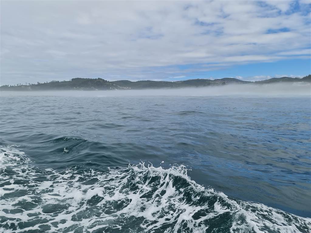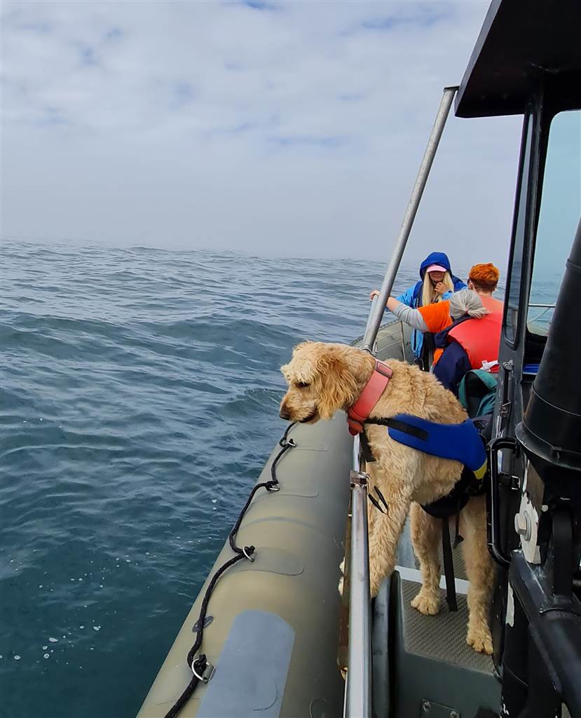 הסירה עולה ויורדת על הגלים , איתנו גם הכלב של קארי שיודע לנבוח כשהוא מזהה לוויתנים