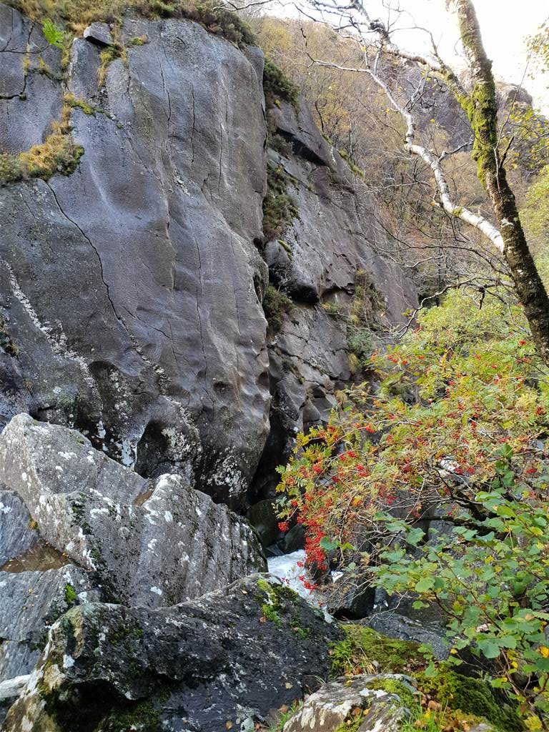 חלק אחר של הדרך עובר ליד זרימה מרשימה ורועשת בין סלעי ענק כהים