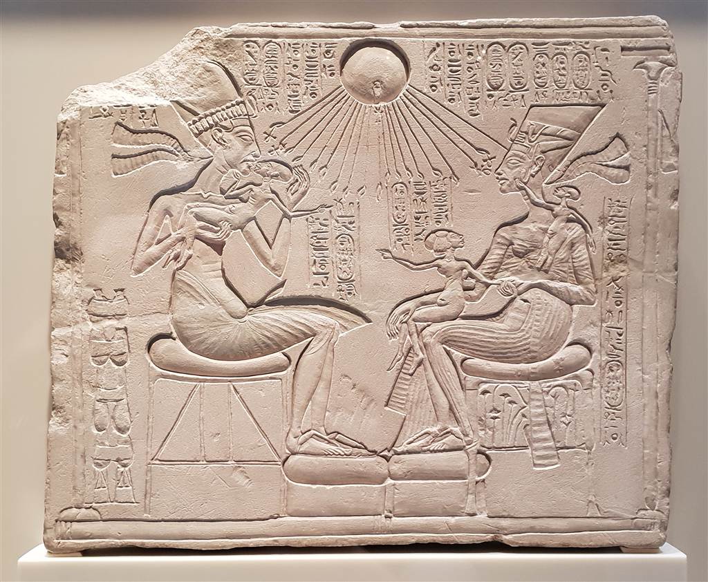 רואים בתמונה אותו יושב עם נפרטיטי אשתו ועם שלוש בנותיהם, מתחת לקרני השמש…