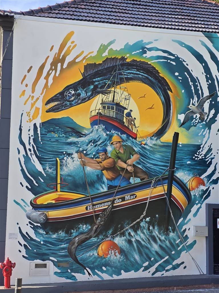 כבר בכניסה לכפר קידם את פנינו הציור הענק הבא, ופה יש לכם הזדמנות לראות מקרוב בחלק העליון של הציור את ידידנו דג סינוואר או בשמו האמיתי Scabbardfish. איך נראה לכם?