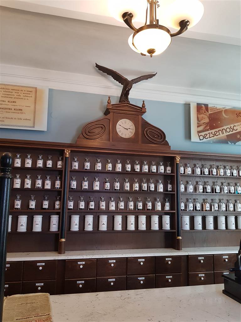 הנה כך נראה פתח בית המרקחת, כולל הנשר שהעניק לו את שמו. צילמתי גם את מחברת המרשמים של תדאוש פנקייביץ.