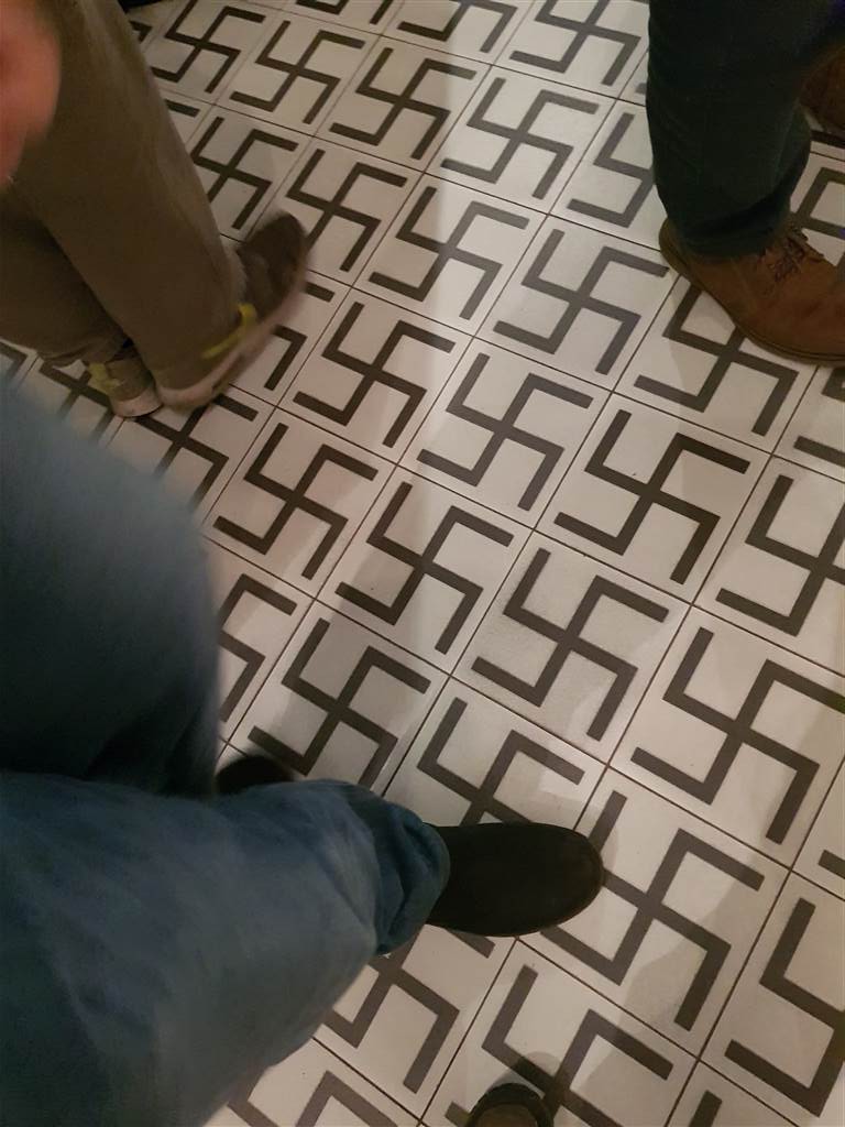 בכל מקום בו יש צלב קרס, הסוחרים מדביקים מדבקה ירוקה קטנה ומדגישים באוזנינו "היטלר קאפוט". אנחנו הסרנו לרגע את המדבקה לצורך הצילום.